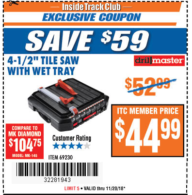 ITC 4-1/2" TILE SAW WITH WET TRAY Lot No. 3733/69230 Expired: 10/30/18 - $44.99 Coupon Code: '11899730'