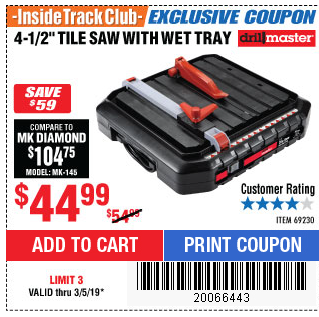 ITC 4-1/2" TILE SAW WITH WET TRAY Lot No. 3733/69230 Expired: 3/5/19 - $44.99 Coupon Code: '20066443'