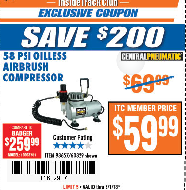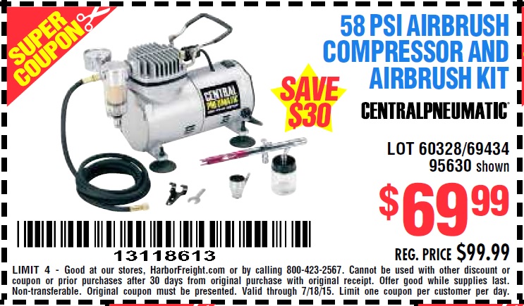 58 PSI AIRBRUSH COMPRESSOR AND AIRBRUSH KIT Lot No. 60328/69434/95630 Expired: 7/18/15 - $69.99 Coupon Code: '13118613'