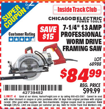 ITC 7-1/4" WORM DRIVE PROFESSIONAL INDUSTRIAL FRAMING SAW Lot No. 68988 Expired: 7/31/15 - $84.99 Coupon Code: '42739482'