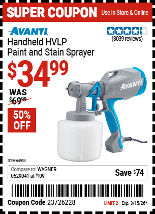 AVANTI HANDHELD HVLP PAINT AND STAIN SPRAYER Lot No. 64934 Expired: 12/31/69 - $37.99 Coupon Code: 'n/a'