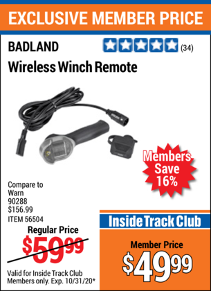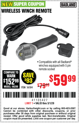 BADLAND WIRELESS WINCH REMOTE Lot No. 56504 Expired: 3/1/20 - $59.99 Coupon Code: '41105427'