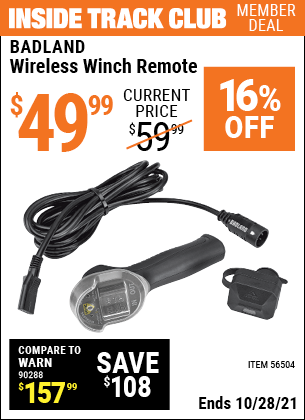 ITC BADLAND WIRELESS WINCH REMOTE Lot No. 56504 Expired: 10/28/21 - $49.99 Coupon Code: 'n/a'