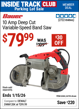 BAUER 10 AMP 5 IN. DEEP CUT VARIABLE-SPEED BAND SAW Lot No. 64194/63444 Expired: 12/31/69 - $79.99 Coupon Code: 'n/a'