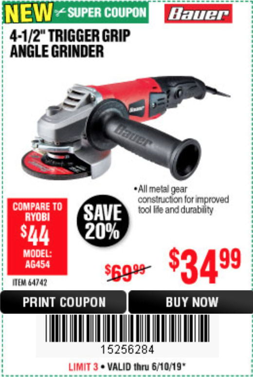 BAUER 8 AMP, 4-1/2 IN. TRIGGER-GRIP ANGLE GRINDER Lot No. 64742 Expired: 6/10/19 - $34.99 Coupon Code: '15256284'