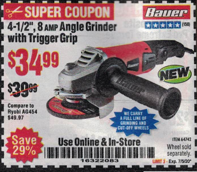 BAUER 8 AMP, 4-1/2 IN. TRIGGER-GRIP ANGLE GRINDER Lot No. 64742 Expired: 7/5/20 - $34.99 Coupon Code: '10543542'