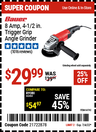 BAUER 8 AMP, 4-1/2 IN. TRIGGER-GRIP ANGLE GRINDER Lot No. 64742 Expired: 7/4/22 - $29.99 Coupon Code: '21722878'