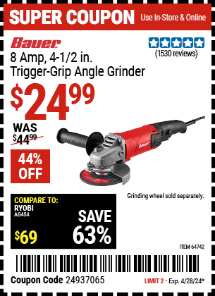 BAUER 8 AMP, 4-1/2 IN. TRIGGER-GRIP ANGLE GRINDER Lot No. 64742 Expired: 4/28/24 - $24.99 Coupon Code: '24937065'