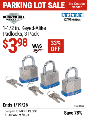 BUNKER HILL SECURITY 1-1/2 IN. KEYED-ALIKE PADLOCKS, 3-PACK Lot No. 61799 Expired: 12/31/69 - $3.98 Coupon Code: 'n/a'