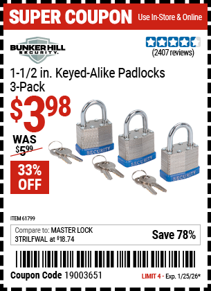 BUNKER HILL SECURITY 1-1/2 IN. KEYED-ALIKE PADLOCKS, 3-PACK Lot No. 61799 Expired: 2/22/15 - $4.99 Coupon Code: '26103134'