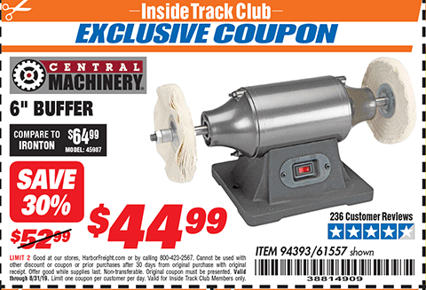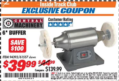 ITC CENTRAL MACHINERY 6 IN. BUFFER Lot No. 61557/94393 Expired: 8/31/17 - $39.99 Coupon Code: '60152031'