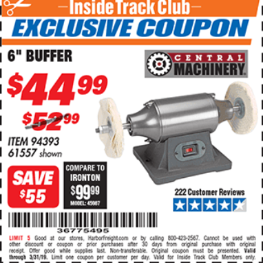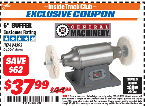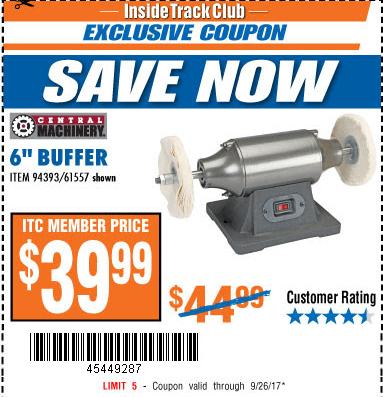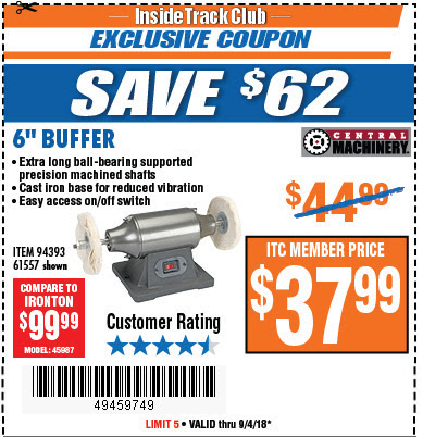 ITC CENTRAL MACHINERY 6 IN. BUFFER Lot No. 61557/94393 Expired: 9/26/17 - $39.99 Coupon Code: '45449287'