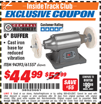 ITC CENTRAL MACHINERY 6 IN. BUFFER Lot No. 61557/94393 Expired: 10/31/18 - $44.99 Coupon Code: '38525661'