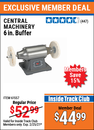 ITC CENTRAL MACHINERY 6 IN. BUFFER Lot No. 61557/94393 Expired: 2/25/21 - $44.99 Coupon Code: 'n/a'
