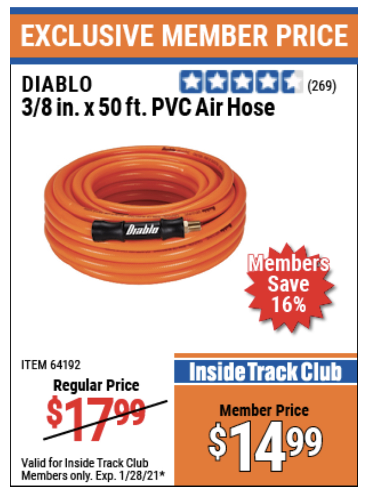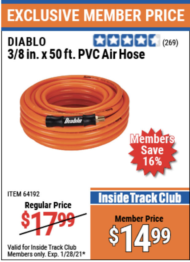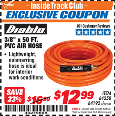 ITC DIABLO 3/8" X 50 FT PVC AIR HOSE Lot No. 64192/64258 Expired: 1/31/20 - $12.99 Coupon Code: '40279808'