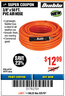 DIABLO 3/8" X 50 FT PVC AIR HOSE Lot No. 64192/64258 Expired: 8/5/18 - $12.99 Coupon Code: '31792701'