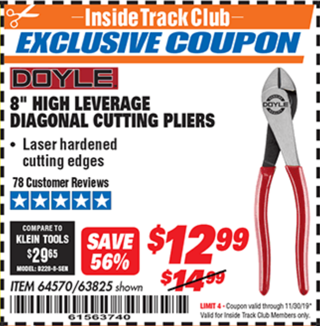 ITC DOYLE 8 IN. HIGH-LEVERAGE DIAGONAL CUTTING PLIERS Lot No. 64570 Expired: 11/30/19 - $12.99 Coupon Code: '61563740'