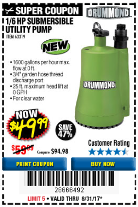 DRUMMOND 1/6 HP SUBMERSIBLE UTILITY PUMP, 1600 GPH Lot No. 63319 Expired: 8/31/17 - $49.99 Coupon Code: '28666492'
