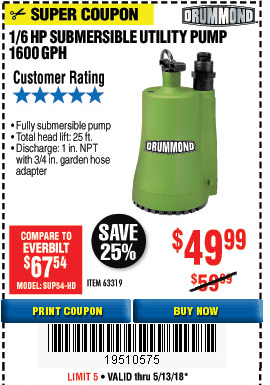 DRUMMOND 1/6 HP SUBMERSIBLE UTILITY PUMP, 1600 GPH Lot No. 63319 Expired: 4/30/18 - $49.99 Coupon Code: '11461572'