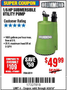 DRUMMOND 1/6 HP SUBMERSIBLE UTILITY PUMP, 1600 GPH Lot No. 63319 Expired: 1/27/18 - $49.99 Coupon Code: '72381537'