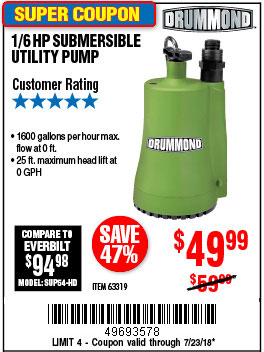 DRUMMOND 1/6 HP SUBMERSIBLE UTILITY PUMP, 1600 GPH Lot No. 63319 Expired: 7/23/18 - $49.99 Coupon Code: '49693578'