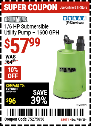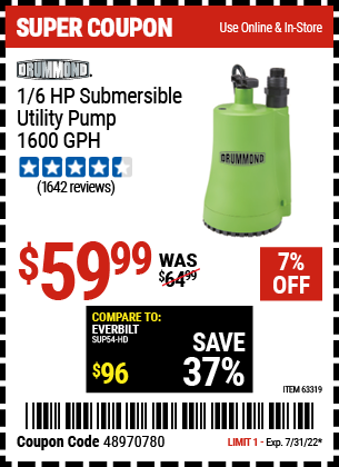 DRUMMOND 1/6 HP SUBMERSIBLE UTILITY PUMP, 1600 GPH Lot No. 63319 Expired: 7/31/22 - $59.99 Coupon Code: '1753815'