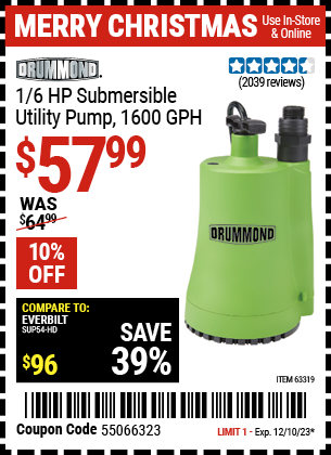 ITC DRUMMOND 1/6 HP SUBMERSIBLE UTILITY PUMP, 1600 GPH Lot No. 63319 Expired: 10/30/25 - $59.99 Coupon Code: 'n/a'
