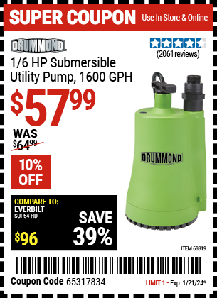DRUMMOND 1/6 HP SUBMERSIBLE UTILITY PUMP, 1600 GPH Lot No. 63319 Expired: 1/21/24 - $57.99 Coupon Code: '65317834'