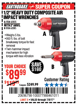 EARTHQUAKE 1/2" COMPOSITE PRO IMPACT WRENCH WITH 2" ANVIL Lot No. 63385 Expired: 7/9/17 - $89.99 Coupon Code: '20696798'