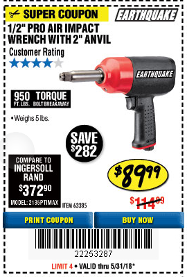 EARTHQUAKE 1/2" COMPOSITE PRO IMPACT WRENCH WITH 2" ANVIL Lot No. 63385 Expired: 5/31/18 - $89.99 Coupon Code: '22253287'