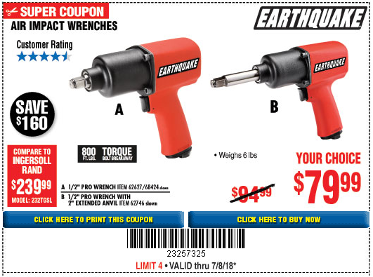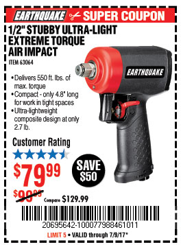 EARTHQUAKE 1/2 IN. STUBBY AIR IMPACT WRENCH Lot No. 63064 Expired: 5/31/17 - $79.99 Coupon Code: '23512663'