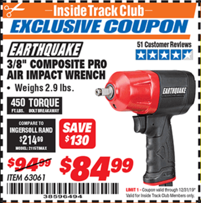 ITC EARTHQUAKE 3/8 IN. COMPOSITE AIR IMPACT WRENCH Lot No. 63061 Expired: 12/31/19 - $84.99 Coupon Code: '38596494'
