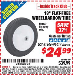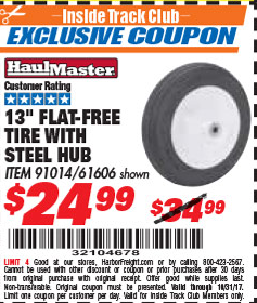 ITC HAUL-MASTER 13 IN. FLAT-FREE TIRE WITH STEEL HUB Lot No. 61606 Expired: 10/31/17 - $24.99 Coupon Code: '32104678'