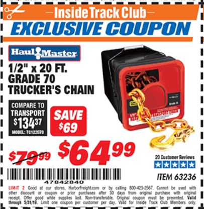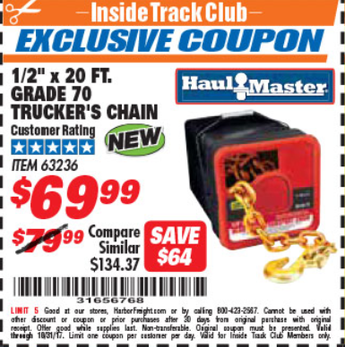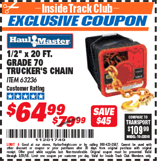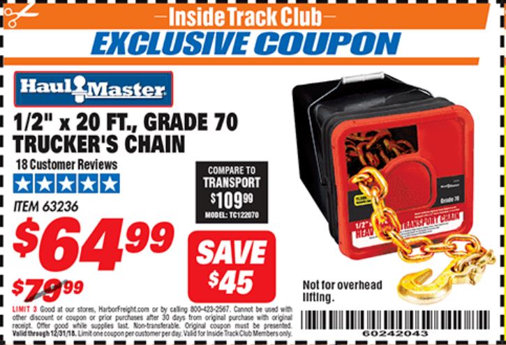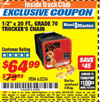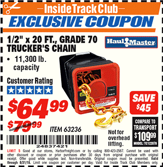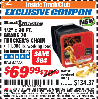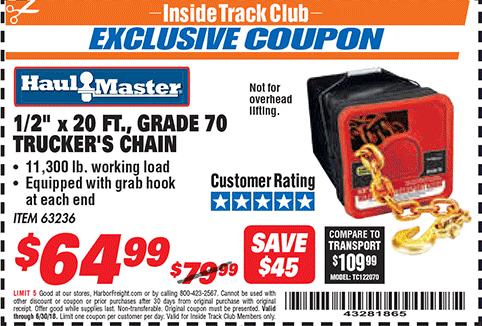 ITC HAUL-MASTER 1/2 IN. X 20 FT. GRADE 70 TRUCKERS CHAIN Lot No. 63236 Expired: 10/31/17 - $69.99 Coupon Code: '31656768'