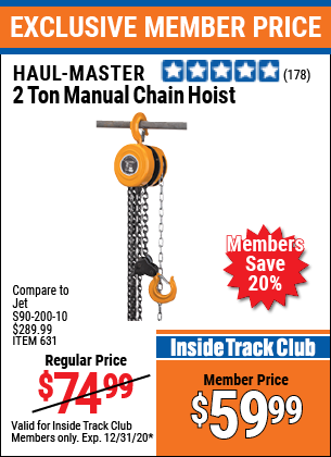 ITC HAUL-MASTER 2 TON MANUAL CHAIN HOIST Lot No. 631 Expired: 12/31/20 - $59.99 Coupon Code: 'n/a'