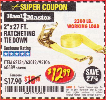 HAUL-MASTER 3300 LB. CAPACITY, 2 IN. X 27 FT. RATCHETING TIE-DOWN Lot No. 60689 Expired: 5/31/17 - $12.99 Coupon Code: '84151028'