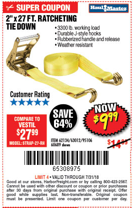 HAUL-MASTER 3300 LB. CAPACITY, 2 IN. X 27 FT. RATCHETING TIE-DOWN Lot No. 60689 Expired: 7/31/18 - $9.99 Coupon Code: '65308975'