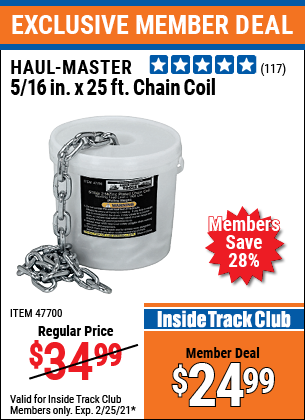 ITC HAUL-MASTER 5/16 IN. X 25 FT. CHAIN COIL Lot No. 47700 Expired: 2/25/21 - $24.99 Coupon Code: 'n/a'