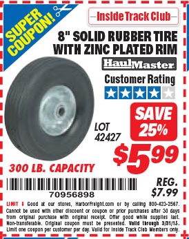 ITC HAUL-MASTER 8 IN. SOLID RUBBER TIRE WITH STEEL HUB Lot No. 42427 Expired: 3/31/15 - $5.99 Coupon Code: '70956898'