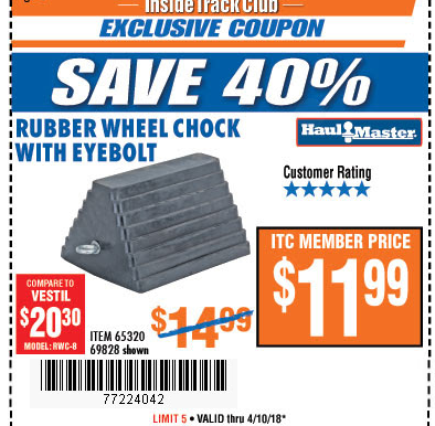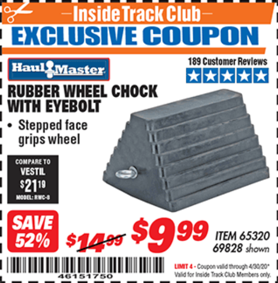 ITC HAUL-MASTER WHEEL CHOCK WITH EYEBOLT Lot No. 69828 Expired: 2/29/20 - $9.99 Coupon Code: '54706215'