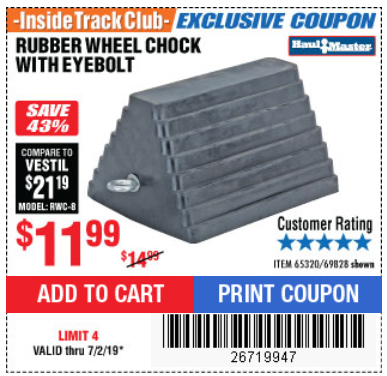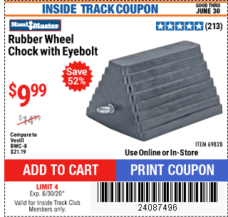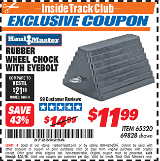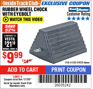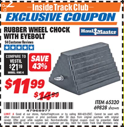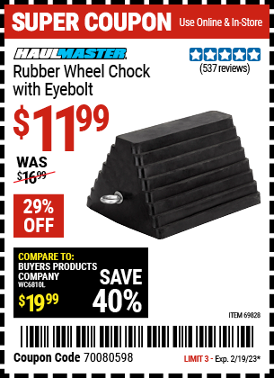 HAUL-MASTER WHEEL CHOCK WITH EYEBOLT Lot No. 69828 Valid Thru: 1/15/26 - $11.99 Coupon Code: 'n/a' (current price - 10% = 0) add to list