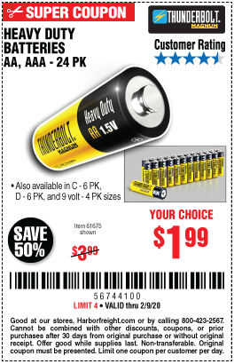 HEAVY DUTY BATTERIES AA, AAA - 24 PK Lot No. 61675 Expired: 2/9/20 - $1.99 Coupon Code: '56744100'