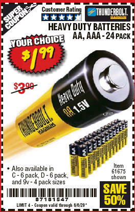 HEAVY DUTY BATTERIES AA, AAA - 24 PK Lot No. 61675 Expired: 1/1/20 - $1.99 Coupon Code: '83729103'