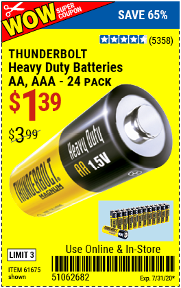 HEAVY DUTY BATTERIES AA, AAA - 24 PK Lot No. 61675 Expired: 7/31/20 - $1.39 Coupon Code: '51062682'