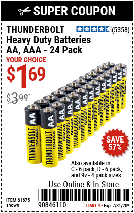 HEAVY DUTY BATTERIES AA, AAA - 24 PK Lot No. 61675 Expired: 7/31/20 - $1.69 Coupon Code: '90846110'