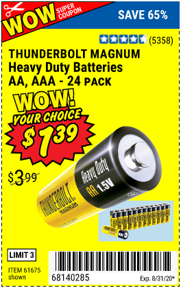HEAVY DUTY BATTERIES AA, AAA - 24 PK Lot No. 61675 Expired: 8/31/20 - $1.39 Coupon Code: '68140285'