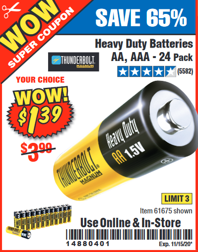 HEAVY DUTY BATTERIES AA, AAA - 24 PK Lot No. 61675 Expired: 11/15/20 - $1.39 Coupon Code: '14880401'