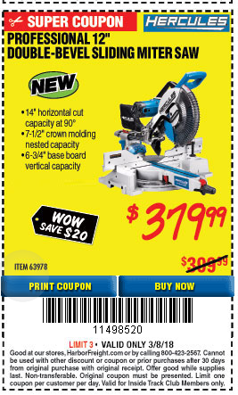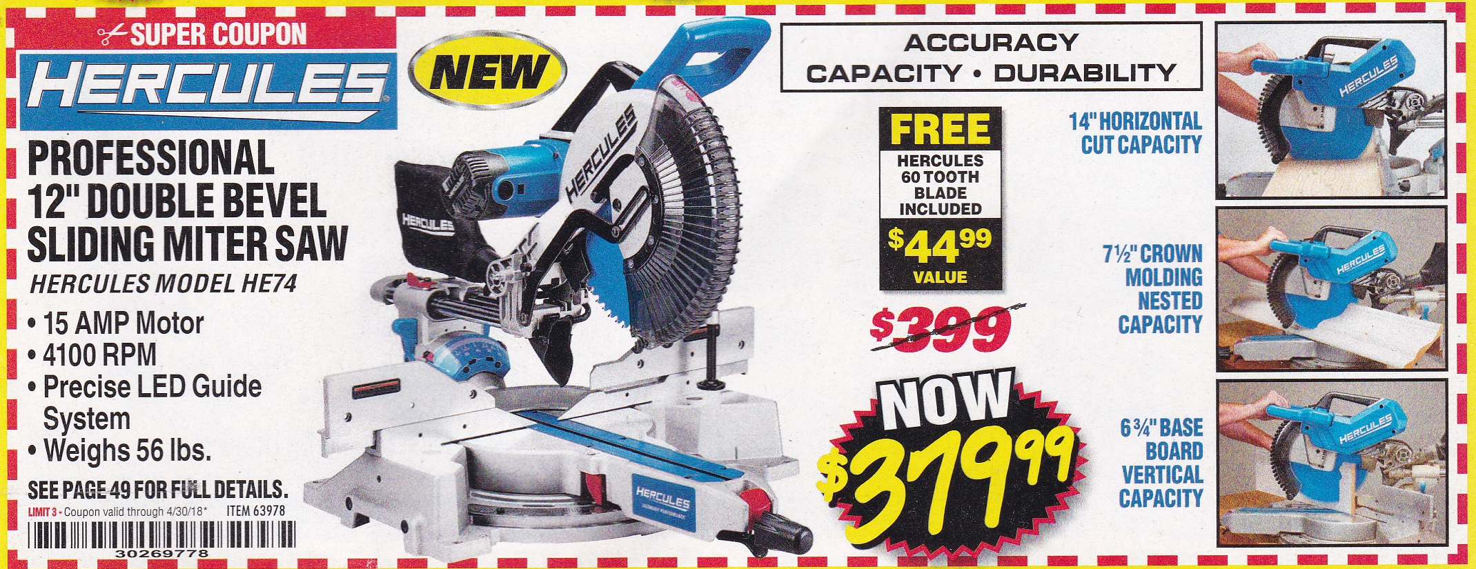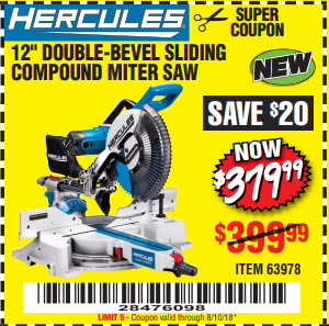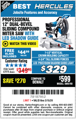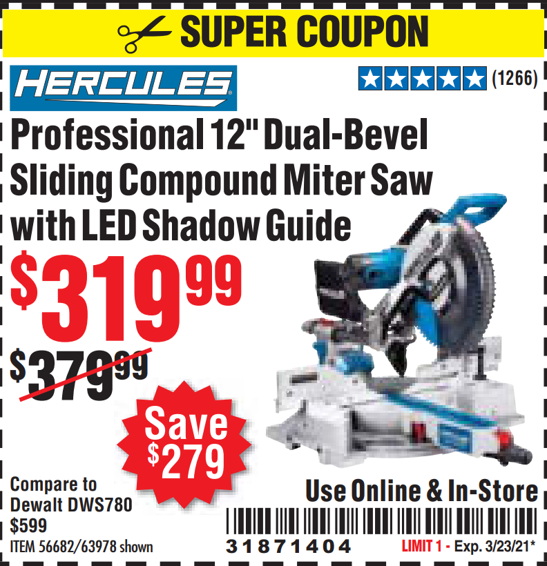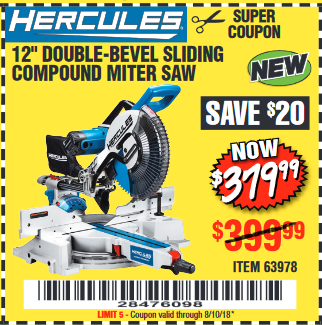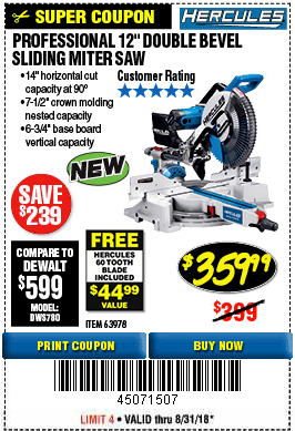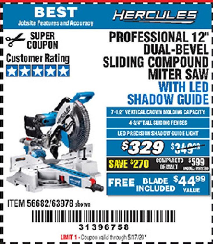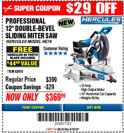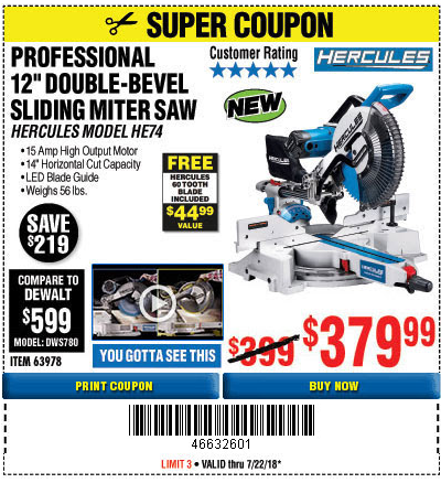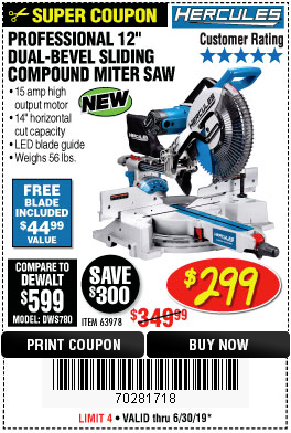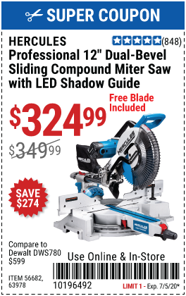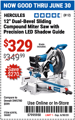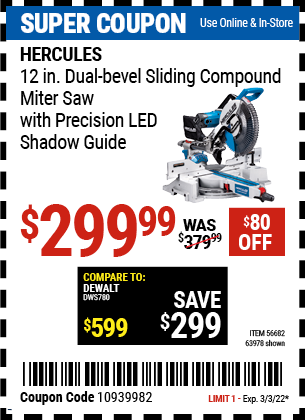 HERCULES 12 IN. DUAL-BEVEL SLIDING COMPOUND MITER SAW WITH PRECISION LED SHADOW GUIDE Lot No. 56682/63978 Expired: 6/30/18 - $369.99 Coupon Code: '10156319'