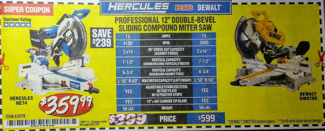 HERCULES 12 IN. DUAL-BEVEL SLIDING COMPOUND MITER SAW WITH PRECISION LED SHADOW GUIDE Lot No. 56682/63978 Expired: 8/31/18 - $359.99 Coupon Code: '45475456'