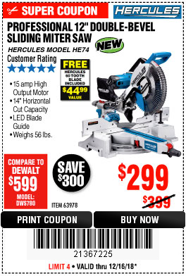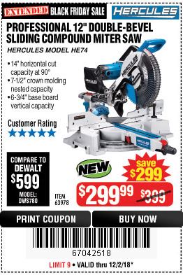 HERCULES 12 IN. DUAL-BEVEL SLIDING COMPOUND MITER SAW WITH PRECISION LED SHADOW GUIDE Lot No. 56682/63978 Expired: 11/30/18 - $299.99 Coupon Code: '14268715'